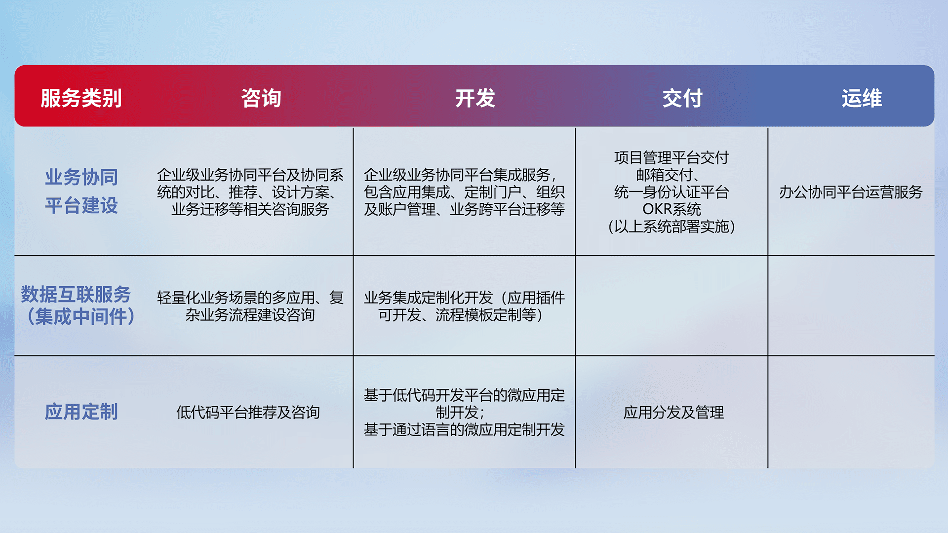 针对钉钉、、企微、、、IDaas等平台级产品提供产品的规划、、、方案、、交付、、、定制化开发等服务,,,,实现如统一协同办公、、智能客户服务、、混合会议管理、、智能数据查询、、、等业务场景,,,实现数字化转型。。
